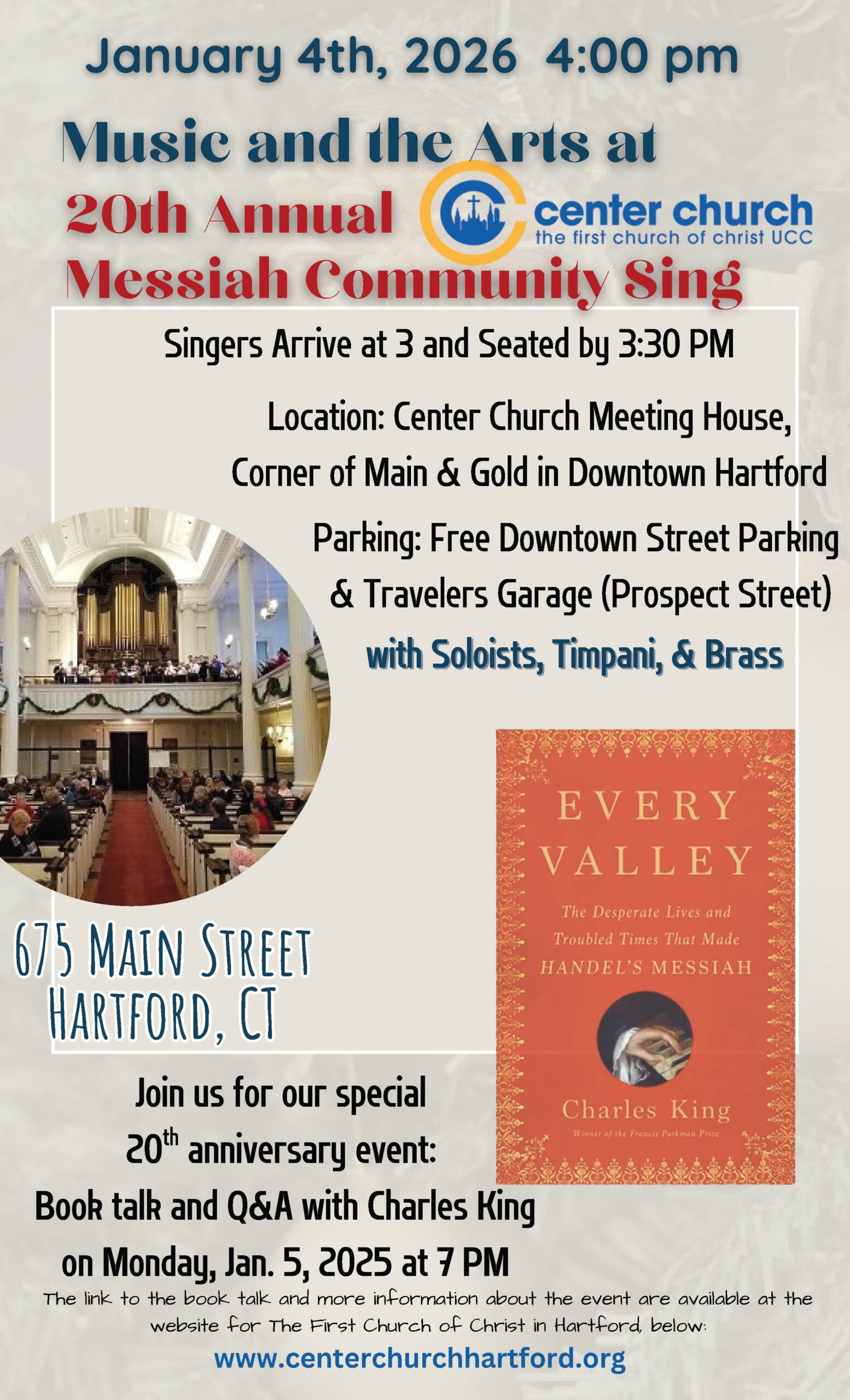 Our 2025-2026 Music and the Arts Season has begun! Download our 2025-2026 Season Brochure below for all concert dates.Our next event will be the 20th Anniversary Greater Hartford Messiah Community Sing & Concert. This year we’ll have brass, timpani, and local soloists to the performance. Join us for a special post-concert reception and an extra special book conversation on Monday, Jan. 5th with Charles King, author of “Every Valley: The Desperate Lives and Troubled Times that Made Handel’s Messiah.” Post-Sing On Line Book Talk & Q and A with Charles King, Author of EVERY VALLEYMonday, January 5, 2026 7 PMhttps://us02web.zoom.us/j/83453108218?pwd=aQSOnywMMLCgLGwjfZUUi1yx7ahCmF.1 Thank you to everyone who made our 19th Annual Messiah Sing a Success!If you missed the event, you can watch the video here!
